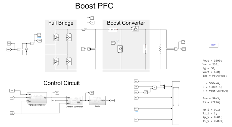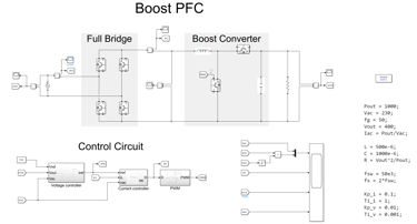 A simulink model of a boost PFC with an inner current controller and an outer voltage controller.