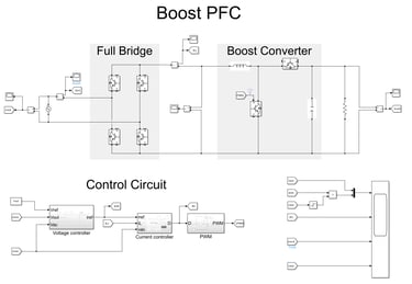 A simulink model of a boost PFC with an inner current controller and an outer voltage controller.