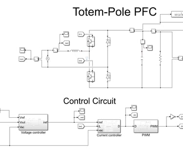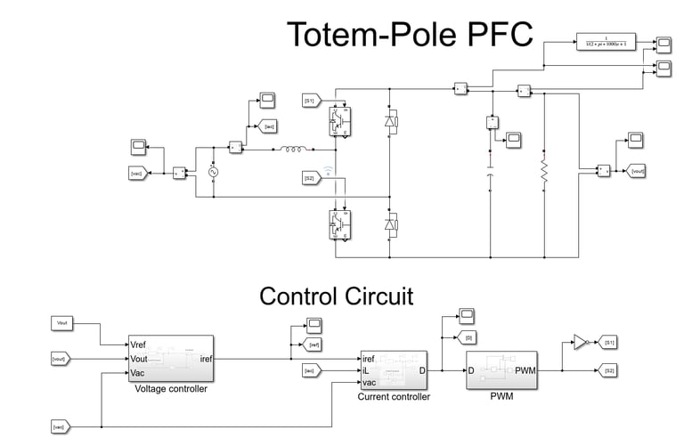 A simulink model of a Totem-Pole PFC with an inner current controller and an outer voltage controller.